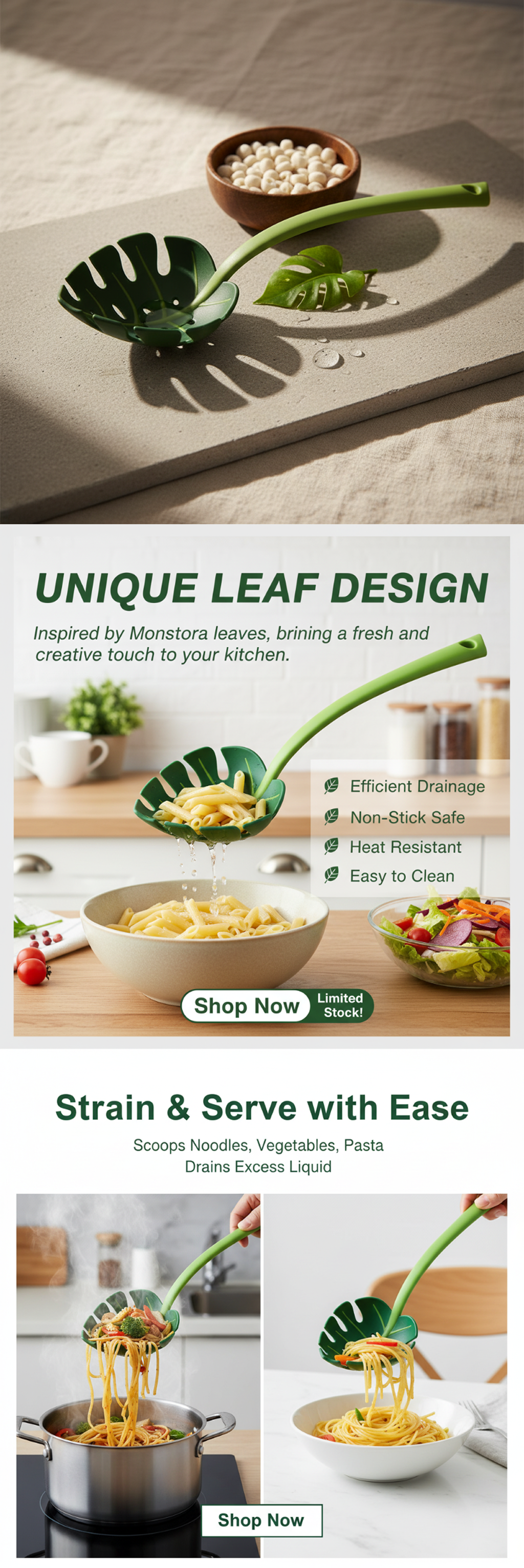 Leaf Shaped Colander Ladle โ Green Kitchen Strainer Spoon for Pasta & Noodles